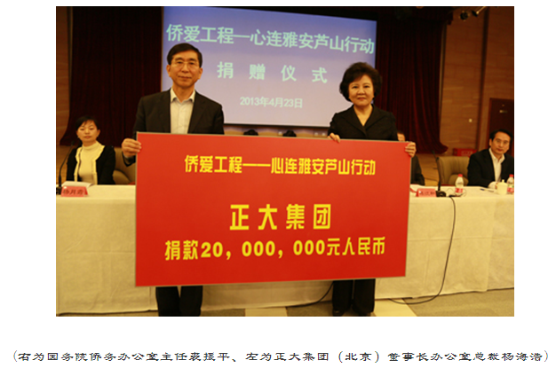 2013年4月20日8時02分,四川省雅安市蘆山縣發生7.0級地震。消息傳來,舉國震動。中國人民心連心,一方有難八方支援,全國人民與雅安人民站在一起。社會各界紛紛伸出了援助之手,對災區進行了各種形式的捐助、支持與幫助。4月23日,正大集團為雅安地震災區捐款人民幣2000萬元,集團(北京)董事長辦公室楊海浩總裁代表集團出席國務院僑辦舉行的“僑愛工程——心連雅安蘆山”行動捐贈儀式。